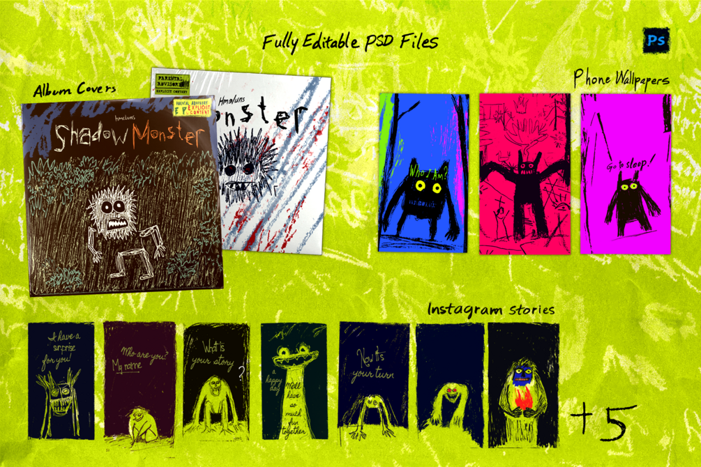 #HandDrawn, #MonsterIllustrations, #DigitalArt, #PSDfiles, #GraphicDesign, #TShirtDesign, #AlbumCoverArt, #PosterDesign, #BookIllustration, #EditableFiles, #CreepyArt, #FunDesigns, #IllustrationPack, #UniqueGraphics, #PNGFiles, #ArtisticDesign, #DIYDesign, #CreativeAssets, #CommercialUse, #SpookyArt